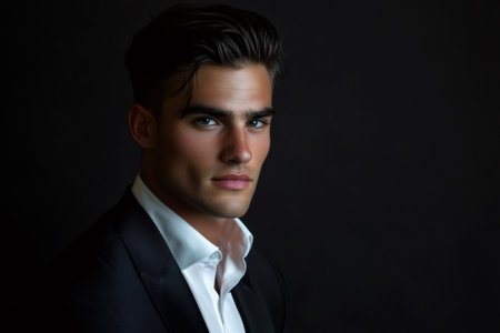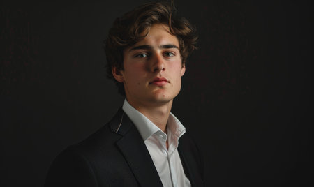Minimalistic portrait of a young man in a crisp white shirt and dark suit against a pure black background