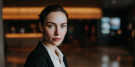 This portrait captures a confident woman exuding professionalism and strength. Her serious expression and elegant attire convey determination and beauty.