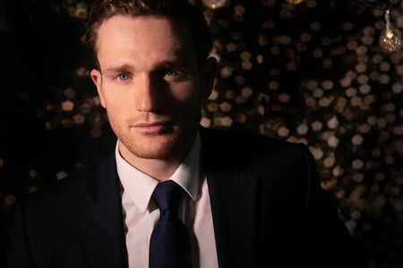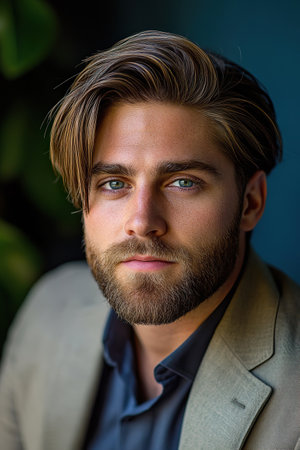 Good looking man in suit with blue eyes and beard looking at camera with bokeh in the background and room for copy