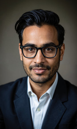 A South Asian man with sleek black hair, glasses, and a focused expression, surrounded by dynamic energy lines, symbolizing calculated