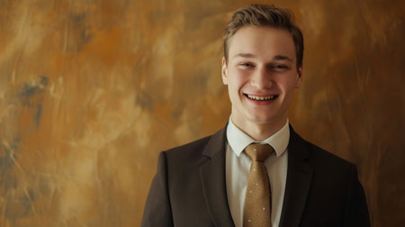 A young diplomat in a crisp white shirt and patterned tie gazes thoughtfully at the viewer with the delicately blurred background featuring muted gold tones adding an air of sophisticatio