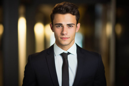 Detailed headshot of a young male executive with a clear, serious expression, in business attire, set against a soft-focus background