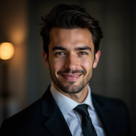 A headshot of a young, confident businessman in a suit, smiling slightly and looking directly at the camera.
