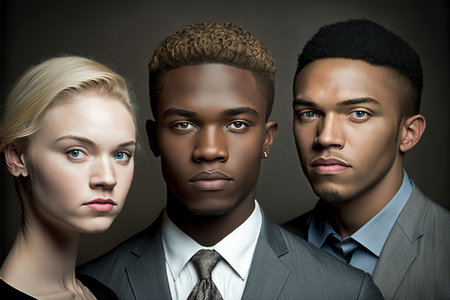 An AI-generated illustration of a business team of multiracial people standing in front of a camera