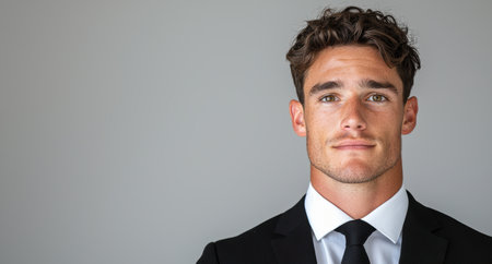 Businessman in a suit, confidently looking at the camera. Copy space on the left for text or branding.