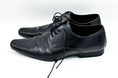 Used black shoes with tied laces. Isolated on white background with soft shadow