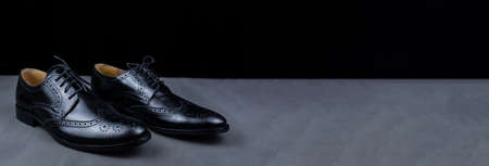 Pair of black shoes on a black background. Men's fashion shoes. Classic men's shoes made of genuine leather. Men's accessories. Elegant stylish shoes