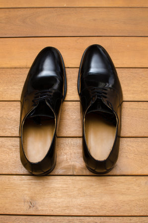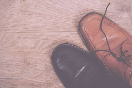 Fashion concept with male shoes on wooden background