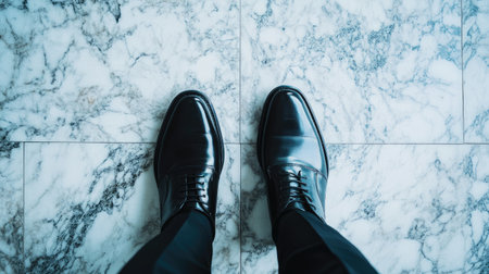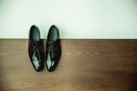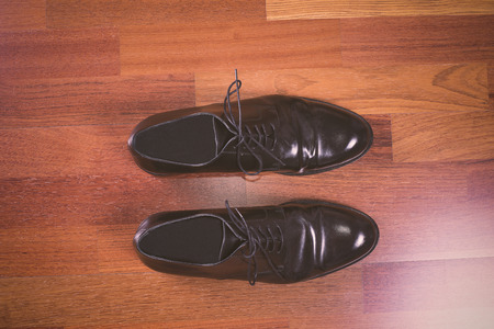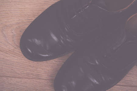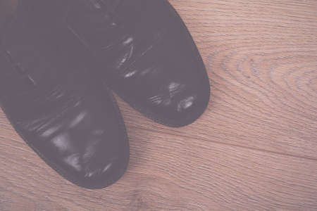 Man black shoes on a black wooden floor. Business flat lay background with a copy space.