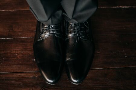Mens black shoes on the floor. Wedding in Montenegro