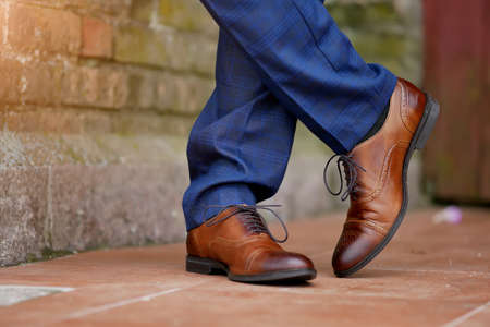 man in brown shoes standing on the wooden floor background