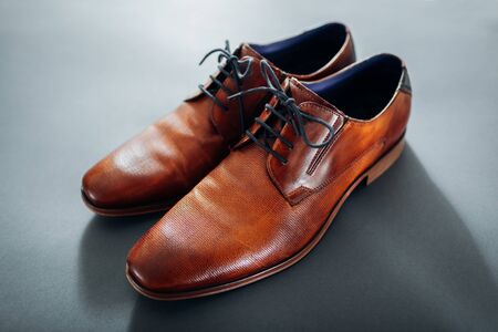 Stylish brown shoes for the groom. casual shoes on wooden background