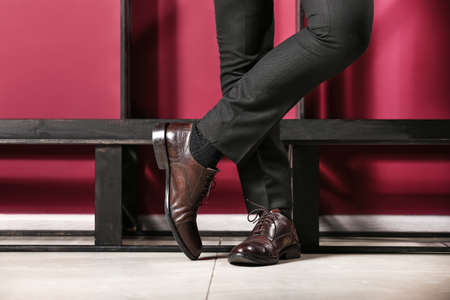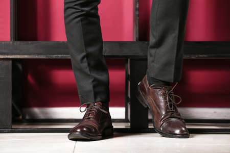 Stylish young man in modern shoes near color wall