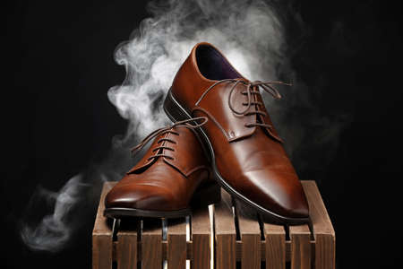 Pair of leather male shoes on wooden box against dark background