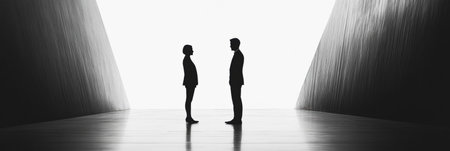 Two business professionals stand facing each other, silhouettes outlined against a stark black and white background while speaking.