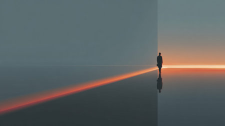 A human silhouette stands still, facing a light path that stretches forward, set in an abstract space with simple colors.