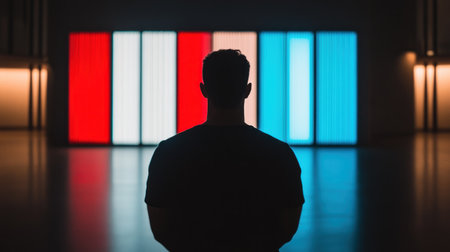 Man standing in art gallery observing colorful abstract artwork displayed on walls. Immersive experience with vivid hues creating dynamic atmosphere.