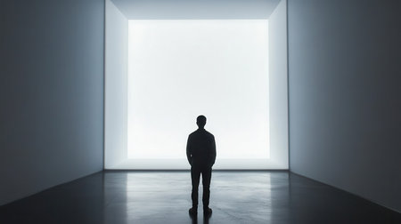 A man stands in a dark room with a single bright white wall in the distance, his silhouette a solitary figure.