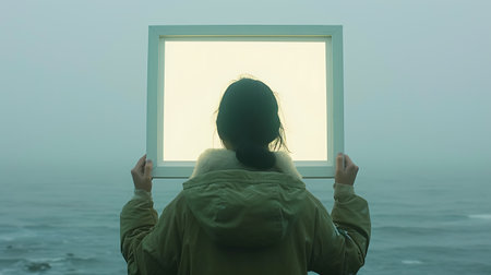 A hand holds a neon frame, glowing in the dark futuristic, artists.