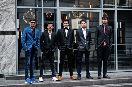 Group of 5 indian students in suits posed outdoor.