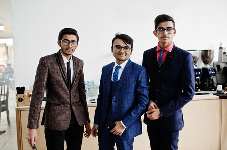 Group of three indian businessman in suits standing on cafe.