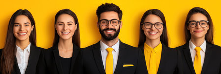 Five professionals smiling together in formal wear, set against a vibrant yellow backdrop.