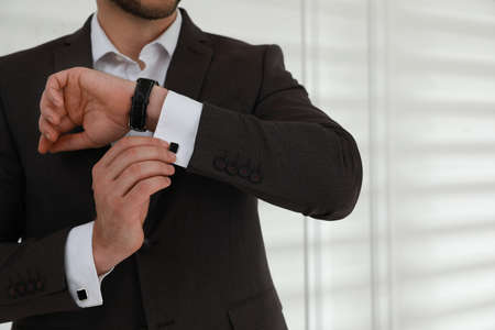 Man wearing stylish suit and cufflinks near white wall, closeup