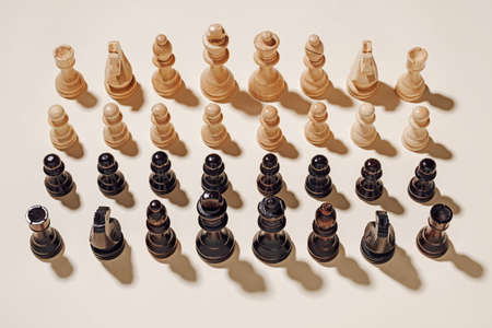 Chess game black and white ready to fight on a beige background. Minimal victory and success competition concept.