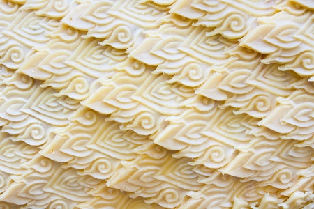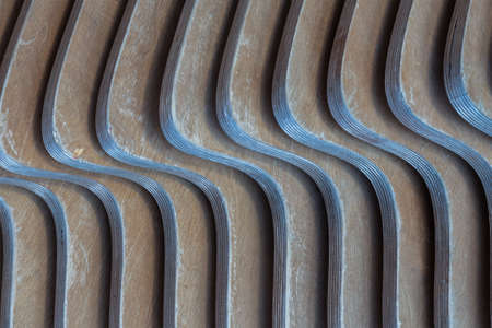 A close-up view of a detailed wood carving featuring flowing, wavy lines and natural grain, creating an organic and intricate textured surface.