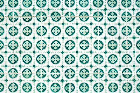 Traditional ornate portuguese decorative tiles azulejos in white and green colours.