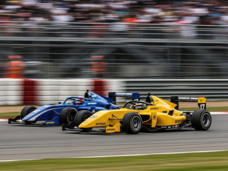 High-definition image showcasing F race cars racing on a professional track, emphasizing their advanced design, speed, and cutting-edge technology, reflecting the essence of competitive