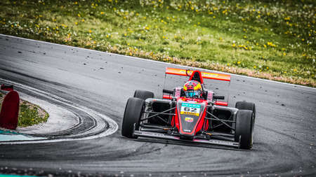 Oschersleben, Germany, April 26, 2019: male racing driver Dennis Hauger driving a Van Amersfoort Racing single-seater car during German ADAC Formula 4 at the Motorsport Arena in Oschersleben, Germany