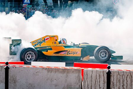 A racing car during a race on the circuit. A racing car is racing to the finish line.