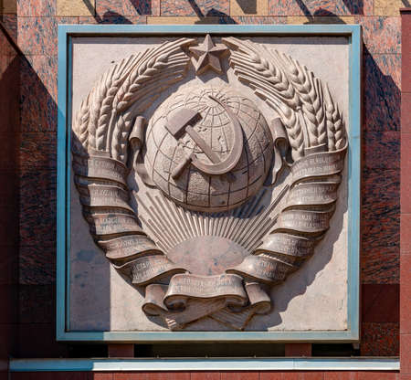 Moscow, Russia - April 30, 2019: USSR emblem on monument on VDNKh park. Soviet architecture bas-relief detail
