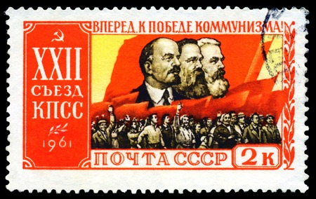 Saint Petersburg, Russia - March 15, 2020: Stamp issued in the Soviet Union with the image of Workers and banners with portraits of Karl Marx, Friedrich Engels, Vladimir Lenin. From the series on 22nd Communist Party Congress, circa 1961