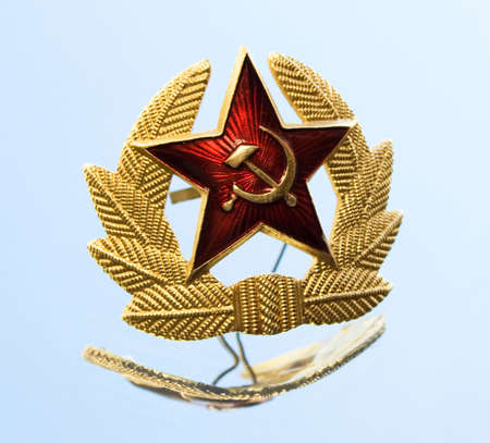 Old soviet military badge with hammer and sickle on light green cloth headgear. Red five-pointed soviet communist gold red star. Symbol of the USSR. Space for the text. Victory Day Concept.