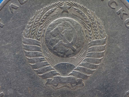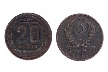 Old USSR money close-up on a white background, isolated. Macro photography of retro coins of the Soviet Union, vintage details