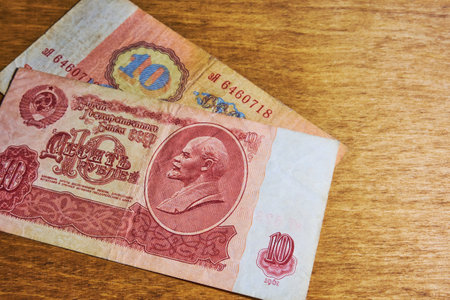 Vintage soviet banknotes on a wooden table