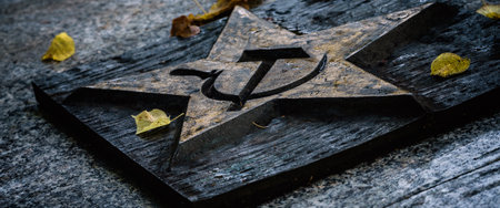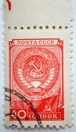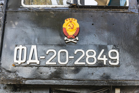 Text and numbers on a metal surface with the symbols of the USSR for design and commercial use.