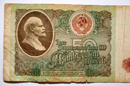 old banknote of 50 rubles of the Soviet Union on a wooden table
