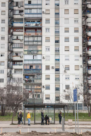 BELGRADE, SERBIA - FEBRUARY 5, 2022: People waiting at a bus stop in front of High rise buildings from the district of Blok 61 in Novi Beograd, a traditional brutalist communist housing ensemble.