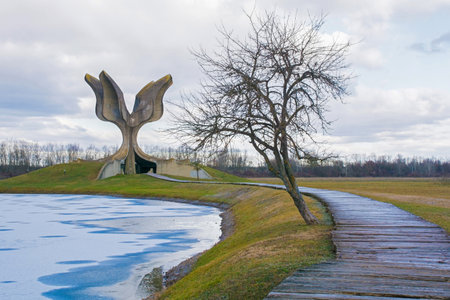 Jasenovac, Croatia - January 3rd 2019. The Stone Flower, a Yugoslavia era war memorial on the site of the former Jasenovac concentration camp