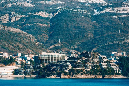Luxury hotel complex Dukley in Budva, Montenegro. Shooting with the old town of Budva promenade