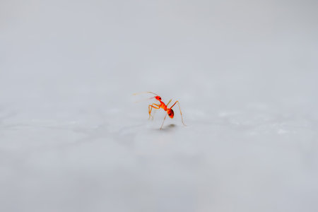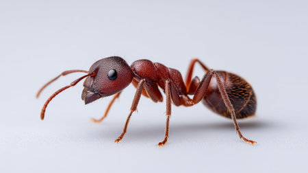 This close-up image captures the intricate details of a red ant, highlighting its unique anatomy, legs, and antennae on a clean, neutral background.