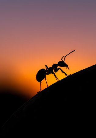 Silhouette of ant on the sunset background. Close up ant