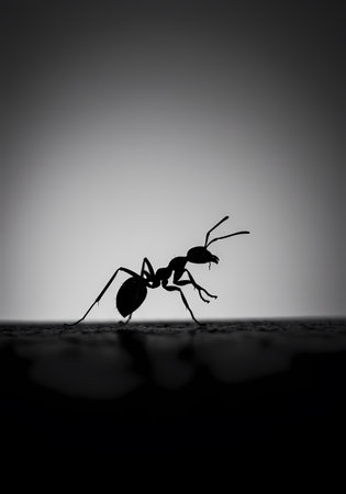 Silhouette of an ant on a black and white background.