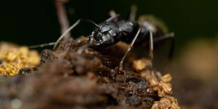 ant carrying a crumb of bread, macro