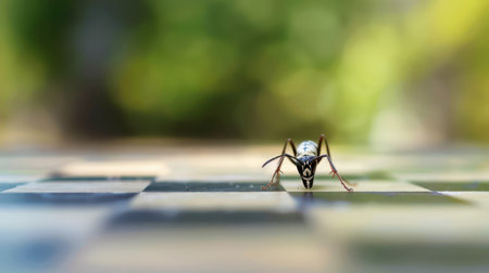 A black and white wasp is walking across a checkered table, with blurry green foliage in the background. The wasp is in focus, while the table and the background are out of focus. The wasp appears to be searching for food or water.