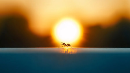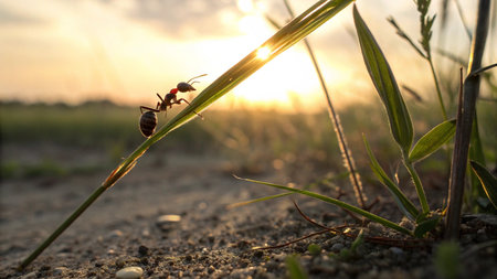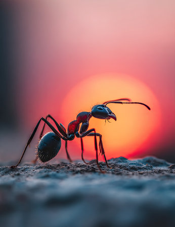 A close-up photograph displays an ant in the foreground, set against a vibrant sunset. The image highlights the ant's detailed anatomy, including legs, antennae, and body segments, with a blurred orange and pink background. This composition uses shallow depth of field, with soft focus on the edges, suitable for nature articles or design projects.