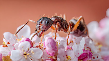 ant on a flower of a peach tree close-up macro photography